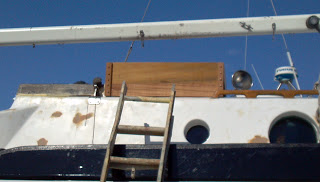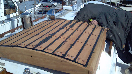 The “Turtle” is designed to protect the sliding hatch from crushing waves, and provide good footing at sea.  It is made from Koa wood, trimmed with African Mahogany.