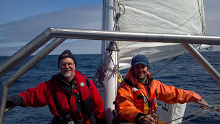 Heres a photo of Dan and Will while on approach to Kodiak.  Much was learned as the crew came together and plans were hatched for many things from gear stowage to shift assignments and rigging enhancements.  We sailed a strict schedule in rotation.  2 hours on, 2 hours off and 2 hours standby.  Right about the time we adjusted, the trip was at an end.  We all resisted the change back to land hours, as the case always is.