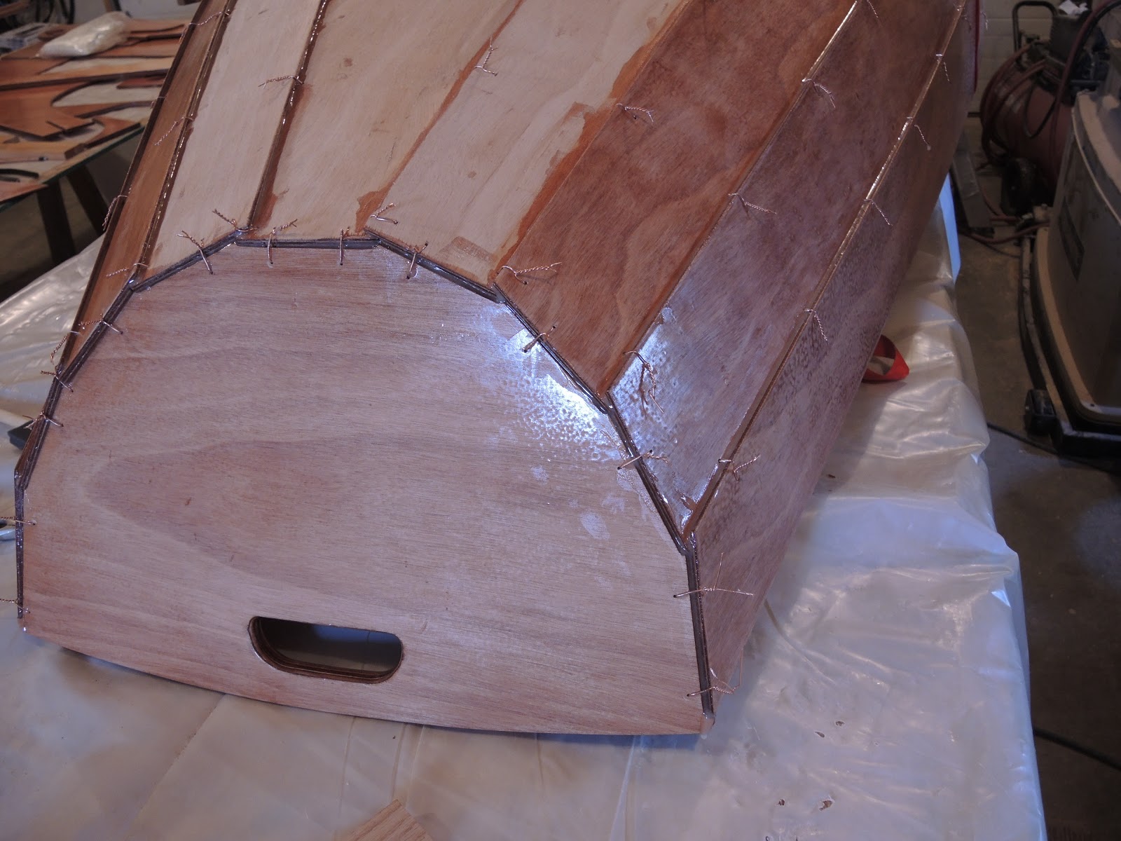 | Many copper stitches, temporarily hold the lapstrake hull together while epoxy fills the gaps. |