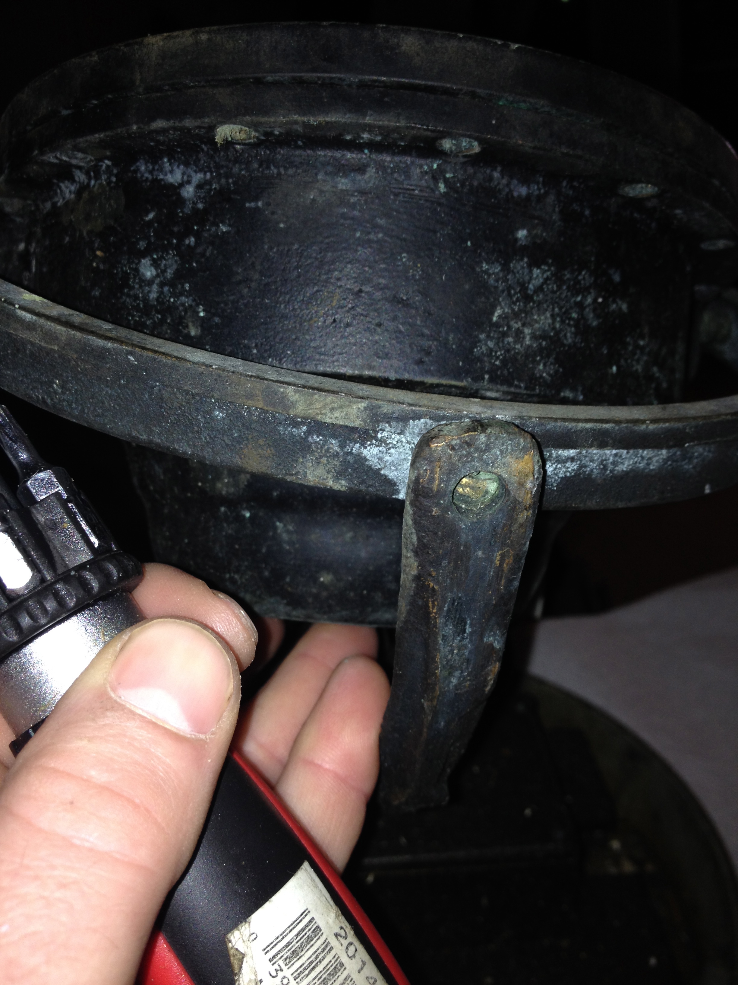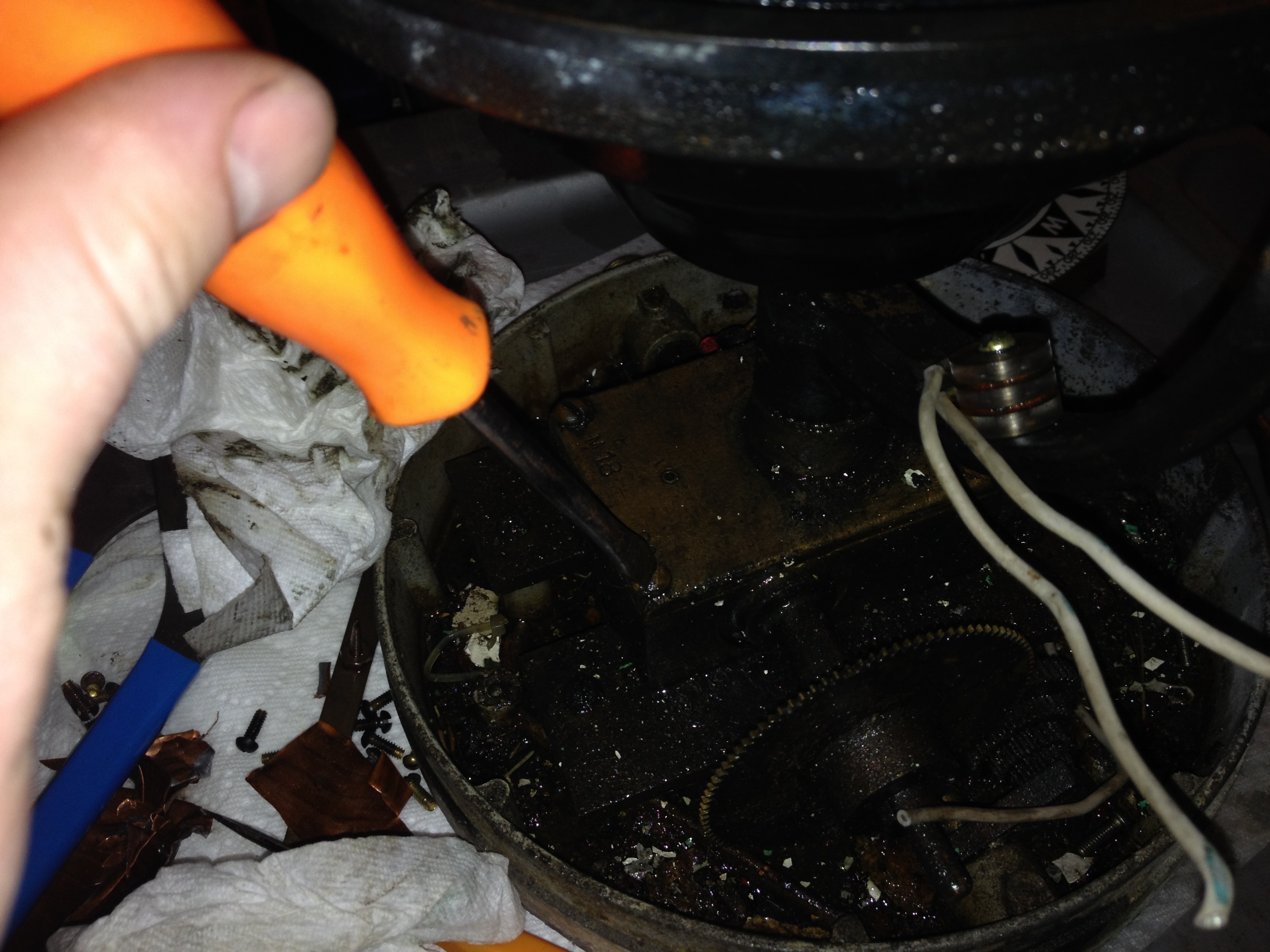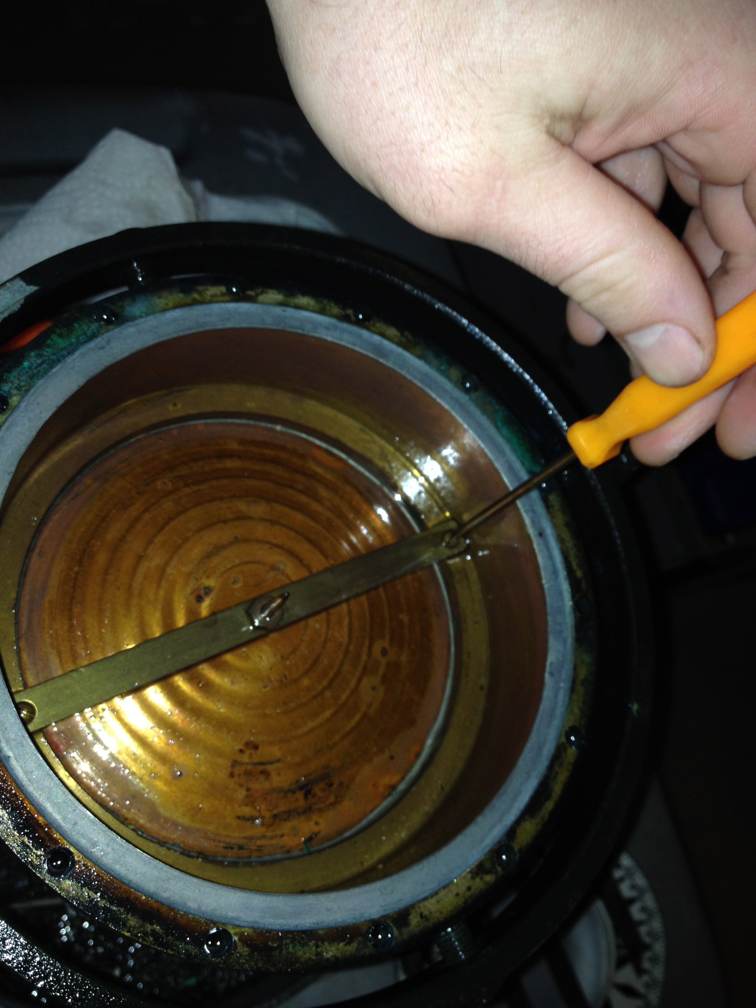 Under all that I found a copper false bottom that held the oil. I cut that out and folded down the edges. I ordered an astrocompass mount from company XXXX and mounted it inside the gimbal dish.